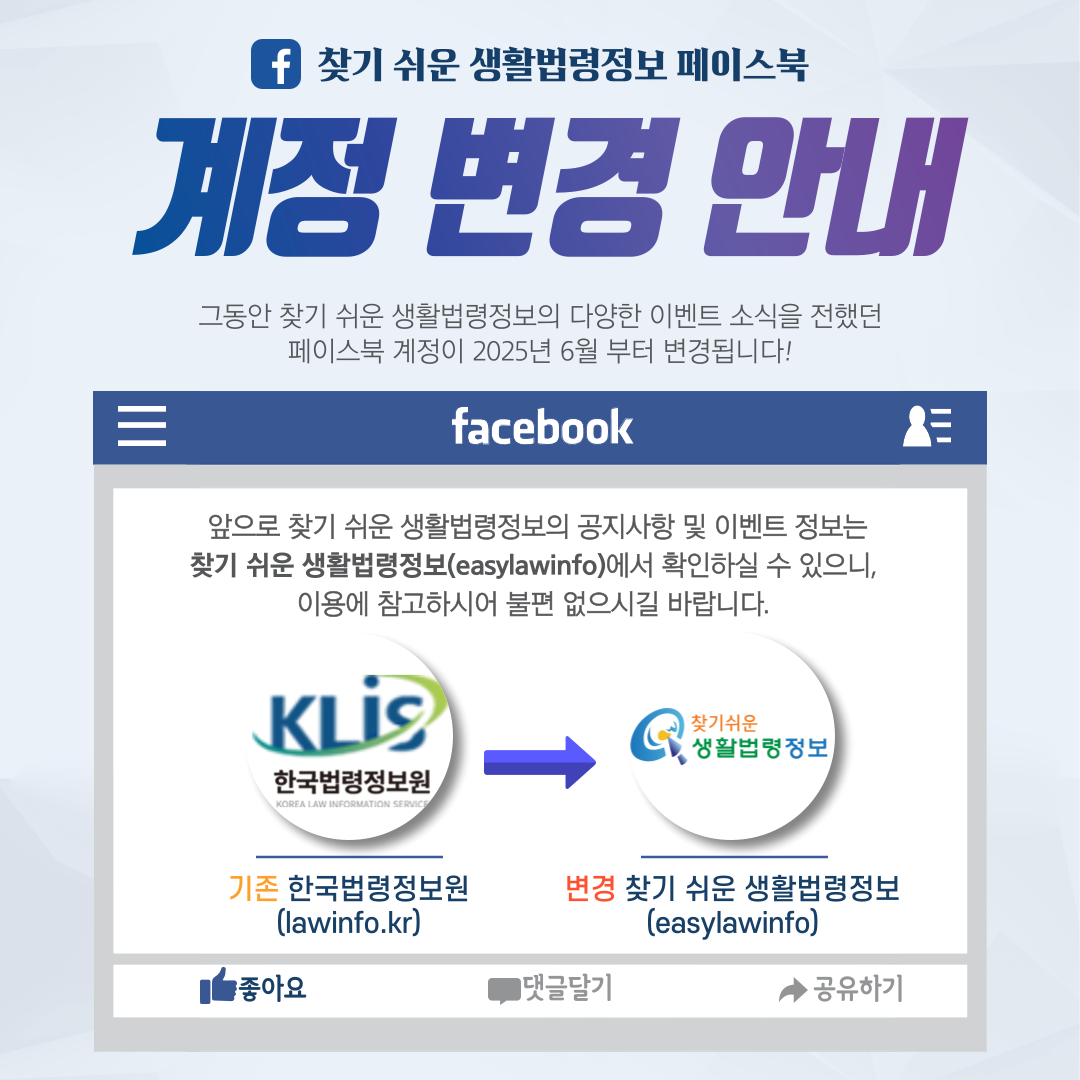 기존에 이용하시던 ‘한국법령정보원(lawinfo.kr)’ 페이스북 계정이 아닌, 앞으로는 ‘찾기 쉬운 생활법령정보(easylawinfo)’ 계정을 통해 공지사항 및 이벤트 정보를 안내해드릴 예정입니다.